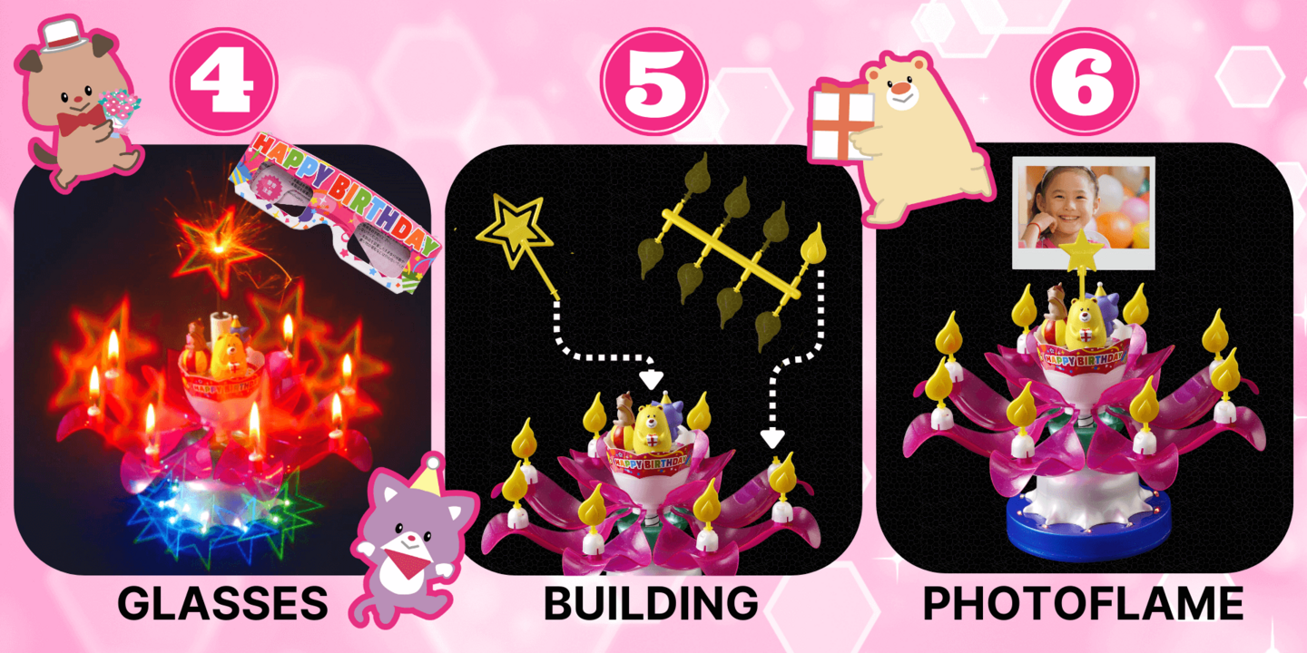 - Companion items: DreamCandle glasses for birthday, DIY assembly for the photo flame, the birthday card and stickers